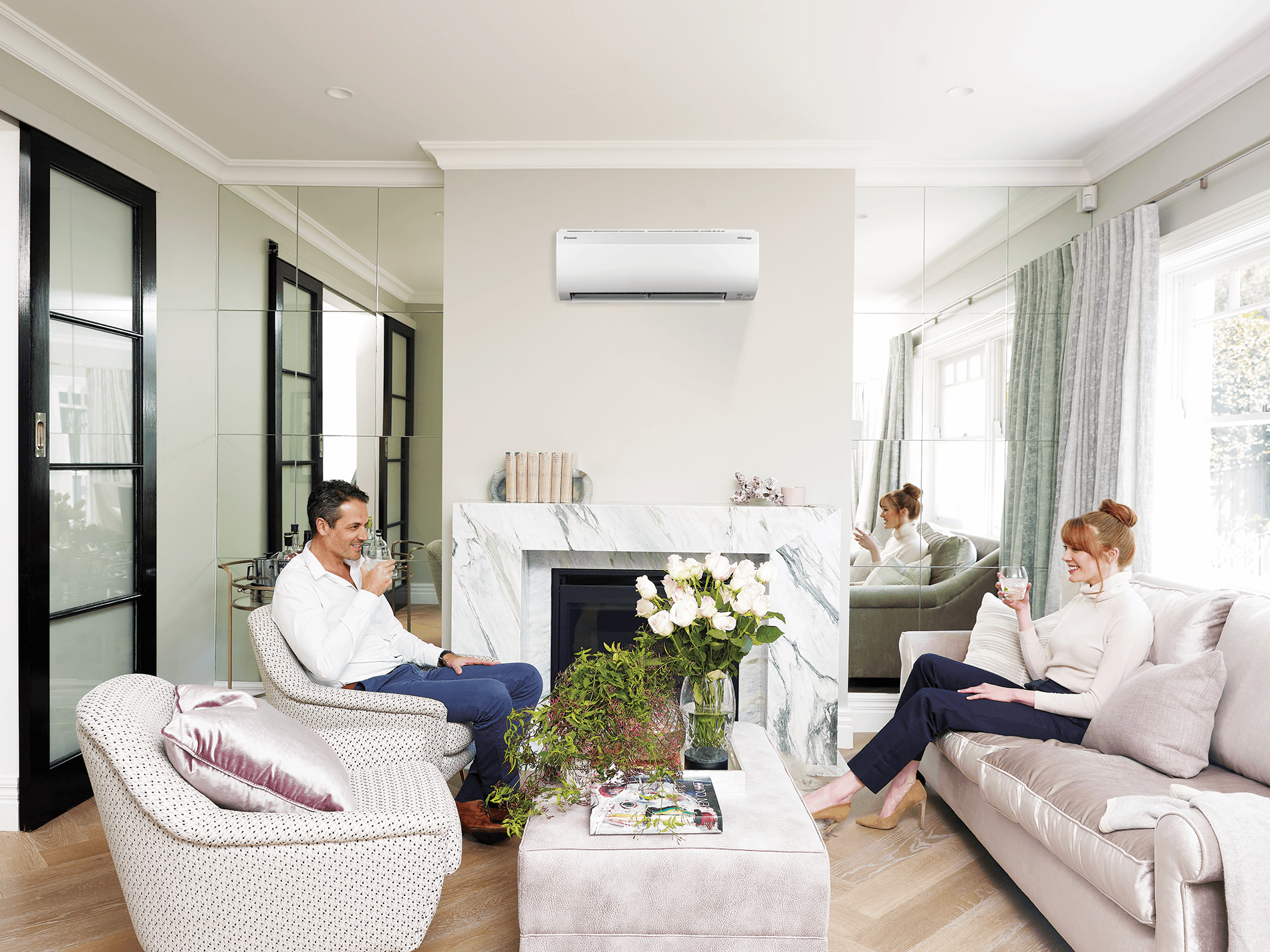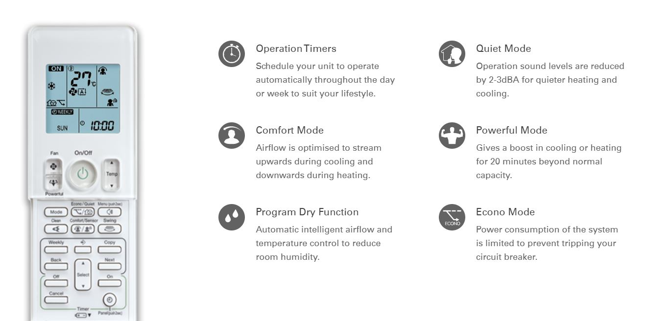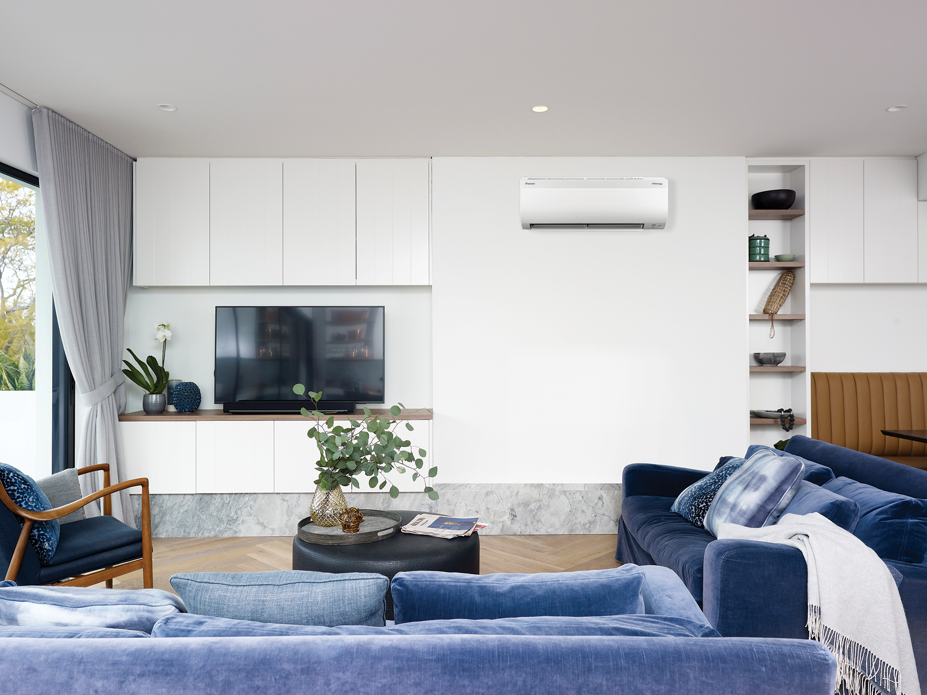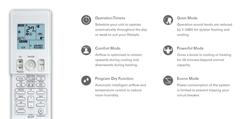 During heating operation, the discharge louvres stream airflow down the wall and towards the floor for improved temperature distribution and comfort.